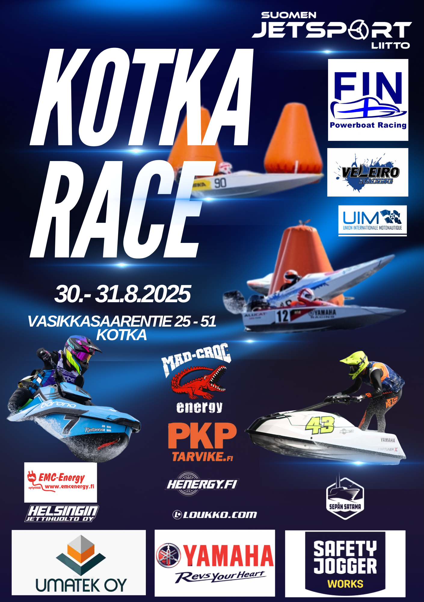 Kilpailukutsu kauden kolmanteen vesijettien SM-osakilpailuun on nyt julkaistu. Kotka Race SM3 järjestetään 30.–31. elokuuta 2025 Kotkan kantasatamassa. Kilpailuviikonloppu saa lisäväriä, kun tapahtuman yhteydessä ajetaan juniorikilpaveneiden SM-osakilpailu GT-10 ja GT-15 -luokissa. Tapahtuma järjestetään yhteistyössä SPV:n / NKT:n kanssa, ja paikallisjärjestelyistä vastaa kokenut Veleiro Racing. Vesijettien Kotka Race SM3 osakilpailun kilpailukutsu ENNAKKOILMOITTAUTUMINEN (päättyy 26.8.2025) https://forms.gle/8tWCZeVna8MTbNZs7MAKSAMAAN OSALLISTUMISMAKSU Lue lisää